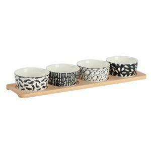 Set de 3 ramequins triangulaires imprimés géométriques noir/blanc en céramique 9,5x3x9,5 cm sur support bambou rectangulaire 28x10 cm
